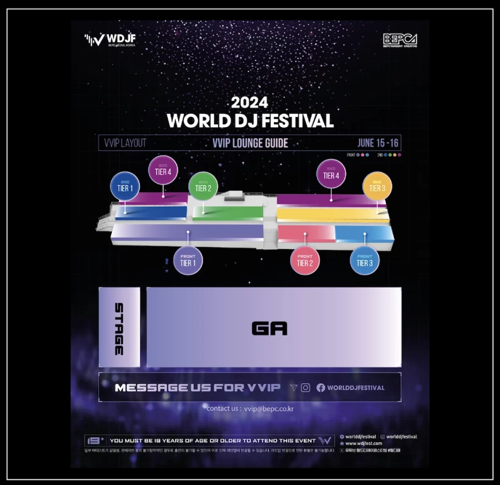 2024년 월디페 vip 테이블 금액은 크게 2종류로 front tier 와 2nd tier 로 대체로 확인할 수 있습니다. front tier 의 경우 스테이지 바로 앞 라인이며, 2nd tier 는 스테이지 뒷편으로 볼 수 있습니다.